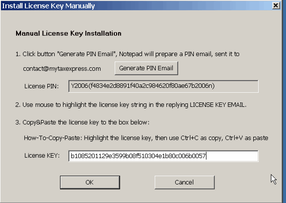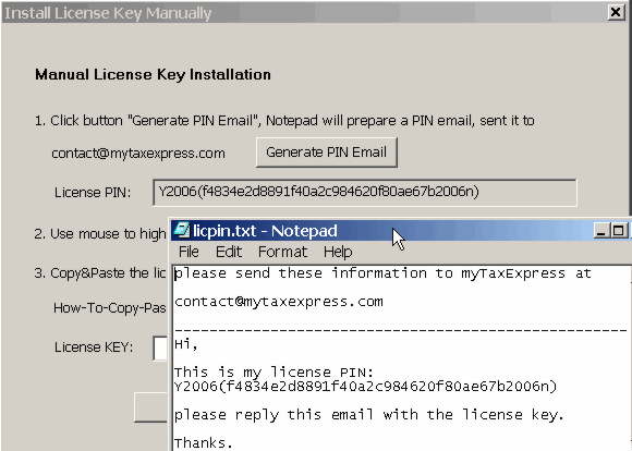 - Click button "Generate PIN Email", Notepad will popup an email with your license