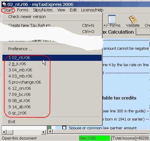 menu, several ever-worked tax return file names are displaying.